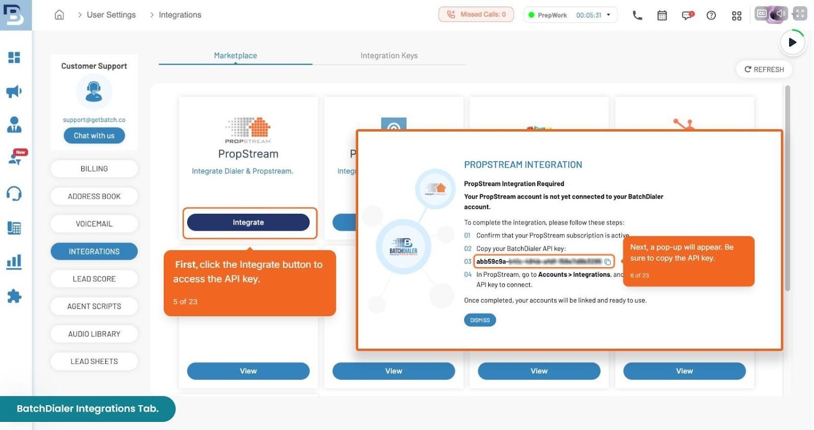 If you are an existing BatchDialer user, log in and go to ‘Account Settings’ and navigate to Integrations to see all the available third-party integrations and select ‘PropStream’ to view and copy the API Key.